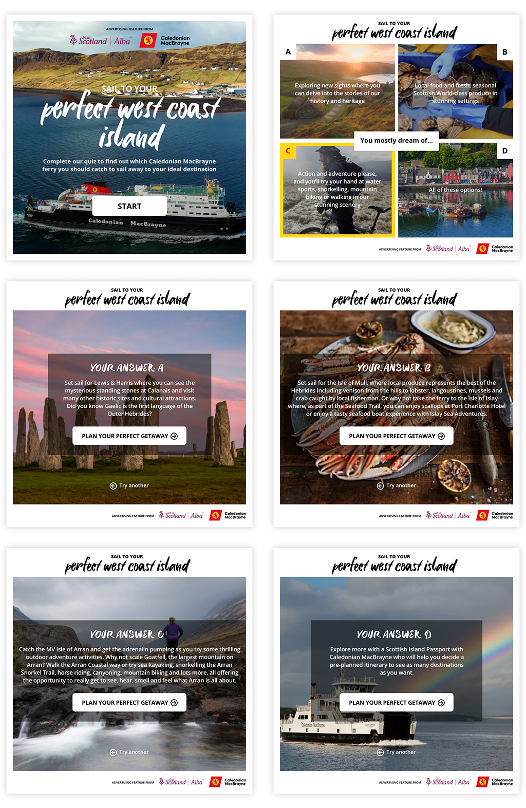 Discover the breathtaking beauty of the West Coast of Scotland. This interactive module for Visit Scotland in partnership with Caledonian MacBrayne ferries suggests an ideal destination that suits your interest. The module was very effective - it produced incredible 17% CTR.